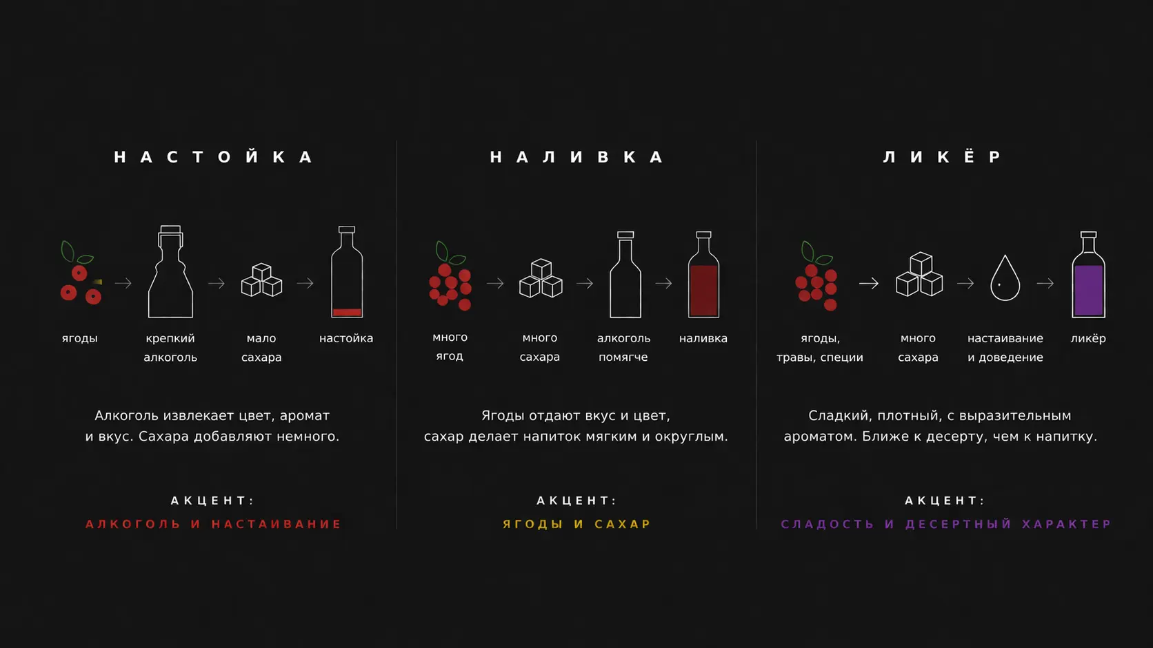 Сырьё: настойка — всё что угодно; наливка — только ягоды и фрукты; ликёр — даже молоко и шоколад.