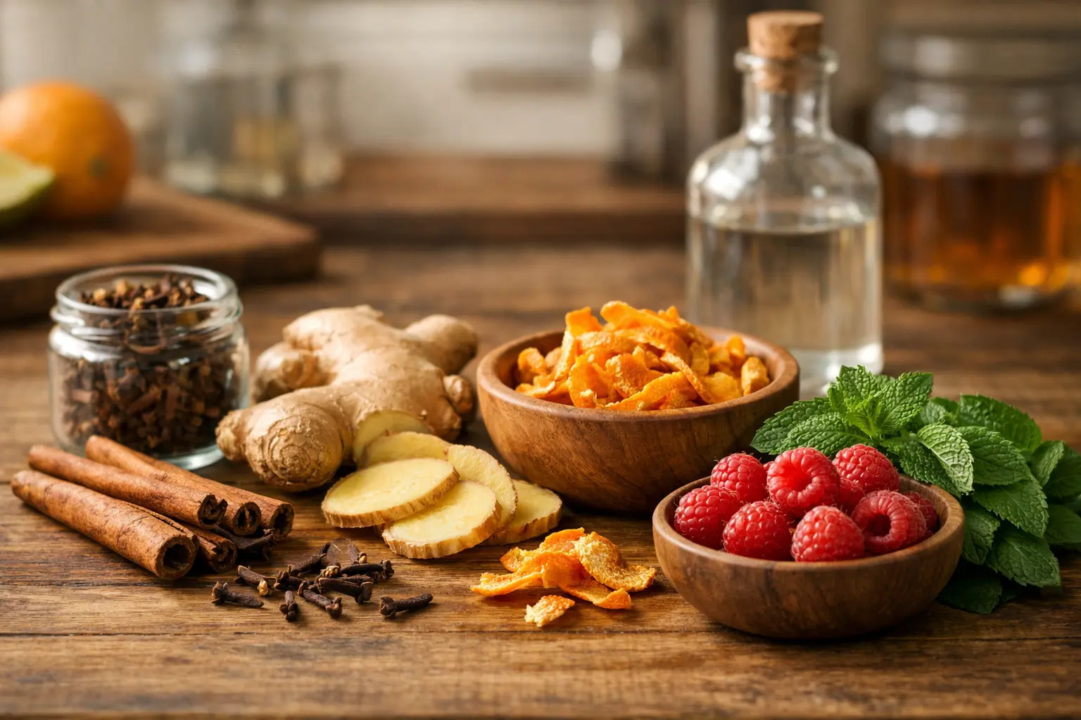 Имбирь нарезай слайсами толщиной 2–3 мм — чем тоньше, тем быстрее и равномернее экстракция. Цедру снимай овощечисткой или мелкой тёркой, только жёлтый слой — белая часть даёт горечь даже при нормальной температуре.