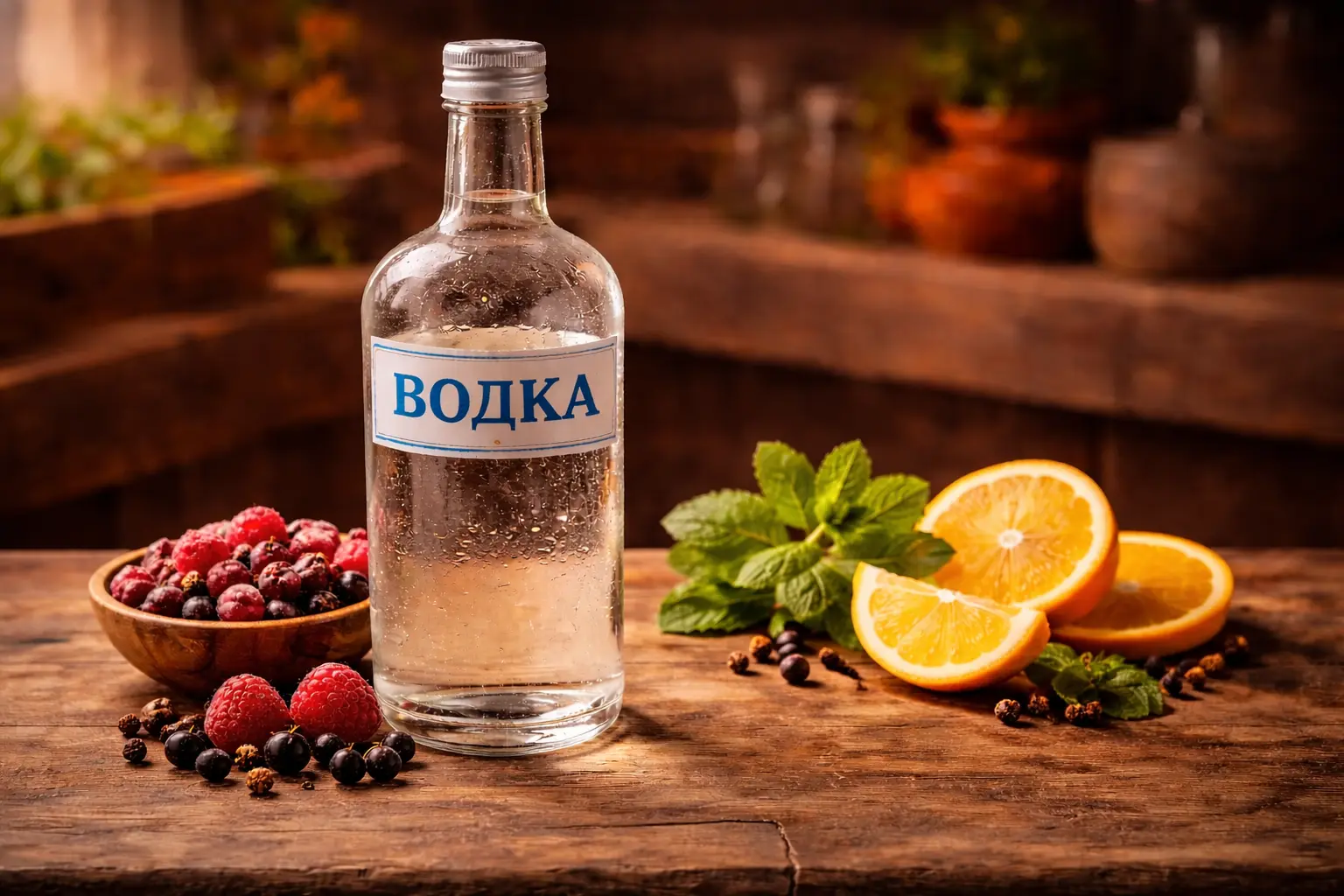 Водка — это ректифицированный спирт, очищенный и доведённый до 40%. Вкус нейтральный, запах почти отсутствует. Именно эта нейтральность делает водку хорошей основой: сырьё раскрывается без конкурента.